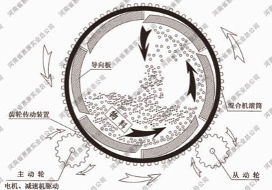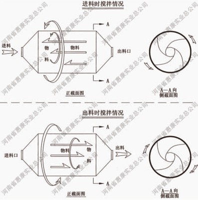 攪拌時,物料隨筒體沿逆時針方向旋轉(zhuǎn)的同時,在慣性作用下向左推移,從而達到混合目的。