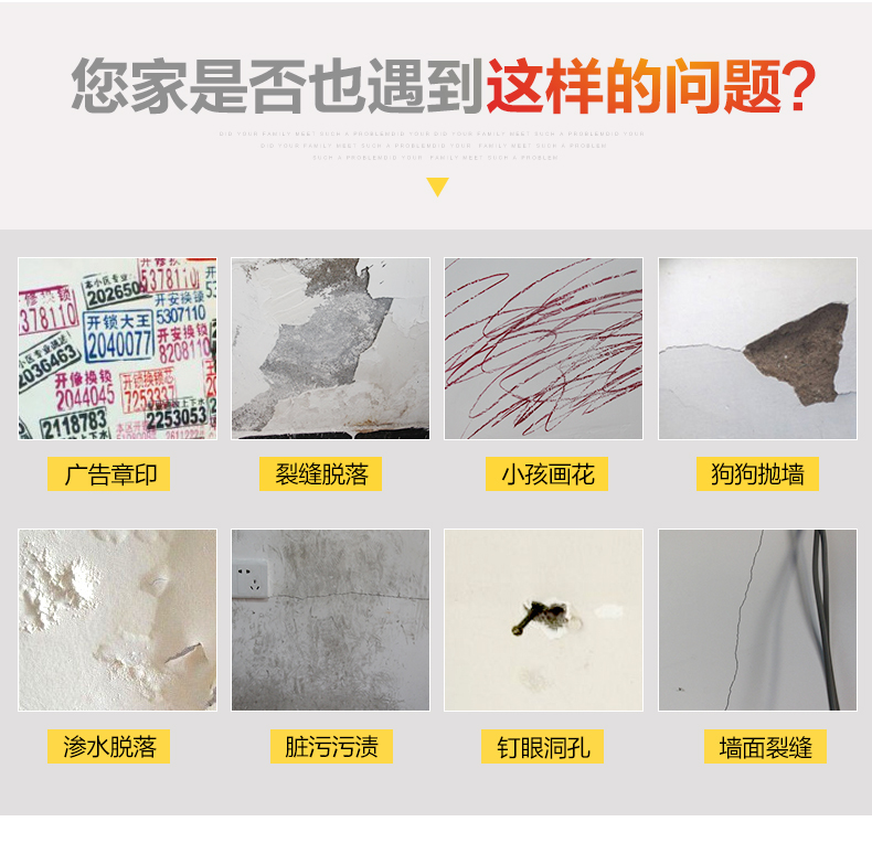 你家是否也遇到這樣的問題:廣告印章、裂縫脫落、小孩兒畫花、狗狗拋墻、滲水脫落、臟污污漬、釘眼洞孔、墻面裂縫。